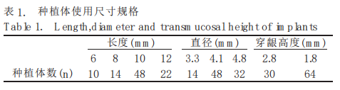 2004 年 10 月~2006 年4月期間,上海交通大學(xué)醫(yī)學(xué)院附屬第九人民醫(yī)院口腔顱頜面種植科就診患者中隨機(jī)選擇 14 例牙列缺損患者, 男 8 例,女6例,平均年齡(57.42±12.12)歲,術(shù)前簽署知情同意書,共植 入 ITI 系 統(tǒng) ( Institut Straumann AG,Switzerland)SLA 表面 (sand- blasted large- grit 病例納入標(biāo)準(zhǔn): ( 1) 下頜無牙頜或余留牙符合拔牙適應(yīng)證,擬種植部位的患牙拔除 3 個(gè)月以上; ( 2)無全身系統(tǒng)性疾病; ( 3) 擬種植部位有足夠的骨寬度和骨高度,足以保證種植體的初期穩(wěn)定性。共94 顆ITI系統(tǒng)SLA表面實(shí)心螺紋種植體。所用種植體規(guī)格見表 1。