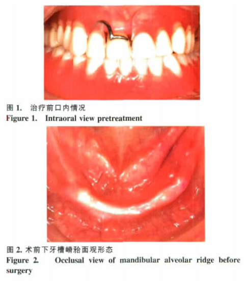 對(duì)納入患者進(jìn)行術(shù)前評(píng)估, 內(nèi)容包括:下頜牙槽骨的寬度、高度,頜骨矢狀關(guān)系。按照標(biāo)準(zhǔn) ITI 手術(shù)流程, 所有種植體由同一專業(yè)口腔種植醫(yī)師采用非埋入式種植方法, 每例患者植入 6~8 顆種植體。所有種植體的植入扭矩均在 35Ncm 以上。術(shù)后 7d 內(nèi)口服抗生素( 頭孢拉定膠囊 0.5g, 每天 4 次; 甲硝唑片 0.4g, 每天 3 次) 和氯己定漱口水。術(shù)后第 7~10天拆線。術(shù)后第 4 周行種植體水平取模, 測(cè)試咬合。術(shù) 后 第 5 周 試 金 合 金 支 架 , 第 6 周 基 臺(tái) 加 力 至35Ncm, 上部結(jié)構(gòu)粘固。上部結(jié)構(gòu)均由實(shí)心基臺(tái)/八角基臺(tái)/角度基臺(tái)+金合金烤瓷全冠組成。上部修復(fù)體設(shè)計(jì)以中線分為兩段固定橋。