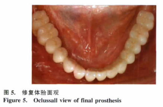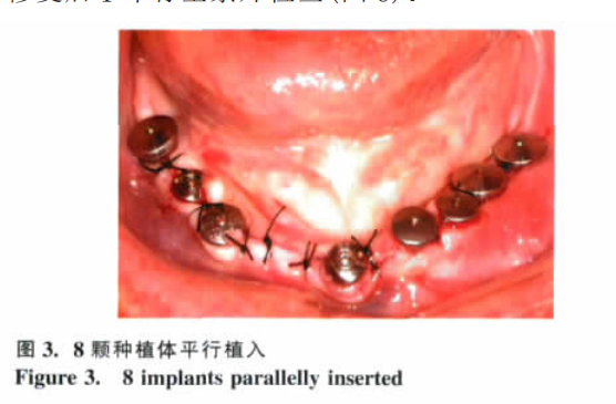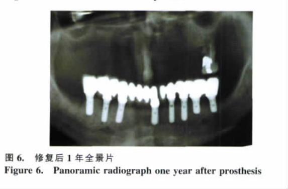 典型病例: 女, 64 歲, 牙列1 7 , 活動(dòng)修復(fù), 要求種植修復(fù)( 圖 1) 。利用下頜活動(dòng)義齒作為影像學(xué)檢查的模板, 確定擬種植部位的骨高度。局部浸潤(rùn)麻醉下于牙槽嵴頂行切口, 翻瓣, 按照術(shù)前設(shè)計(jì)種植部位球鉆定位, 于6541 1346部位平行植入 8 顆種植體( 圖 2~3) 。植入后 4 周攝全景片, 取模, 5 周試金合金支架, 術(shù)后 6 周基臺(tái)加力至 35Ncm。為了便于上部結(jié)構(gòu)的修理和檢查, 采用氧化鋅丁香油粘固( 圖 4~5) 。