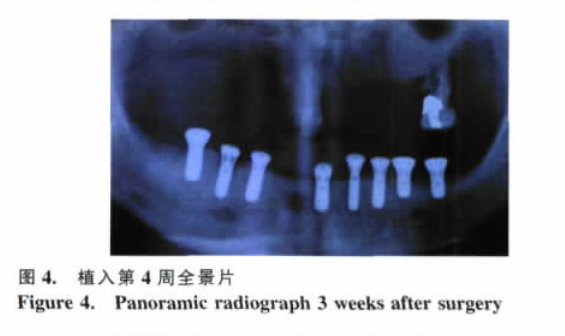 于種植體植入當(dāng)天、第 4 周及修復(fù)后 1 年時(shí)行全景片檢查, 觀察種植體周骨密度和種植部位牙槽骨水平。