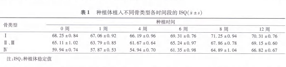 實(shí)驗(yàn)分組 :術(shù)中按照 Lekholm 和 Zarb的骨類型分類標(biāo) 準(zhǔn) J,結(jié)合種植區(qū)預(yù)備中鉆頭遇到的阻力維普資訊維普資訊及影像學(xué)結(jié)果,對術(shù)區(qū)牙槽骨類型分類。I類骨32枚(30.77%),Ⅱ、 Ⅲ 類骨38枚(36.54%),Ⅳ類骨34枚(32.69%)。