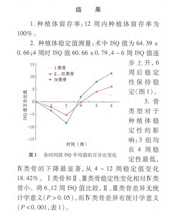 儀器 :動(dòng)度測量儀(IntegrationdiagnosticsAB,Sweden),無線 RFA儀器 ,適合于各種植系統(tǒng)。測量數(shù) 值 為 種 植 體 穩(wěn) 定 值 (implantstabilityquotient,ISQ),數(shù)值范圍1—100,數(shù)值越大,穩(wěn)定性越高。在種植術(shù) 中以及術(shù)后 1、4、6、8、12周 進(jìn)行種植體 ISQ值測量 ,在鄰面和頰舌面各測量兩次 ,取其平均值 。