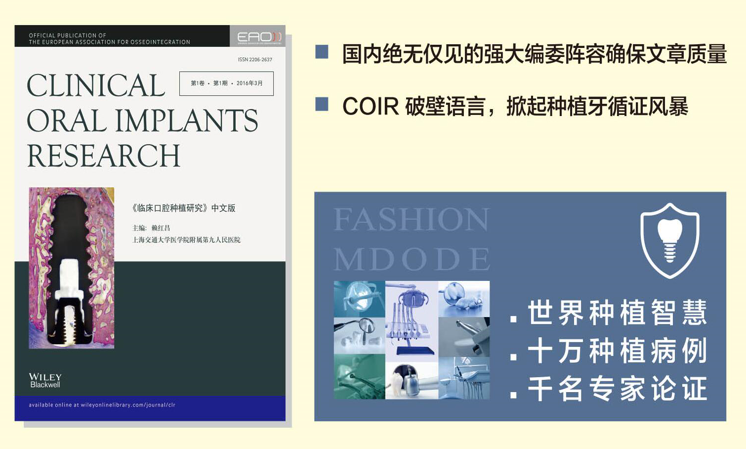 Z:《臨床口腔種植研究》(Clinical Oral Implants Research)是目前口腔種植學領(lǐng)域最具影響力的專業(yè)期刊,其影響因子(impact factor)在整個口腔醫(yī)學領(lǐng)域一直名列前茅。雜志本身就是“循證醫(yī)學”(evidence-based dentistry)的教科書,讓臨床醫(yī)生在臨床決策中“有證可依”,尋求最佳的治療方案。